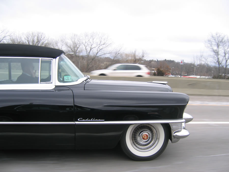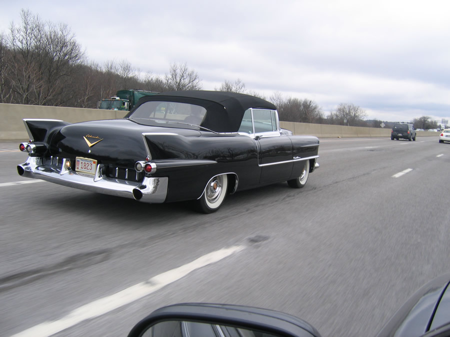 In the second half of the '50's, all cars had fins of some sort. An extended poll lasting many hours of reverie was undertaken to determine the best fins of all. There were some strong second-place contenders, such as the '57 Chevy, still today a top choice of hotrodders, and there were many poor competitors, such as the too-much-too-late '60 Chrysler Imperial in which Jackie rode to JFK's burial. In the end, 100% of me unanimously chose the fins of a 1958 Cadillac as the best of all time, making it my dream car, at least until the arrival of the radically new '61 Chevy. Yesterday I spotted one —a convertible no less! perfect!—on Route 3 in the area of Marshfield, in showroom condition. It was easy to get off a few shots with a little point-and-shoot camera, but only the first, of the rear quarter, was any good, because I was driving and there was traffic. The driver enjoyed my appreciation of his ride. It was doing a steady 60 MPH, so it was no trouble to speed ahead to a rest stop to get a shot of the front, but my timing was off. I did however succeed in revisiting a boyhood daydream; it is left to the reader to decide whether my affinity is more telling of me or the times. There were for me moments when this car was just about the prettiest sight the world had to offer. |