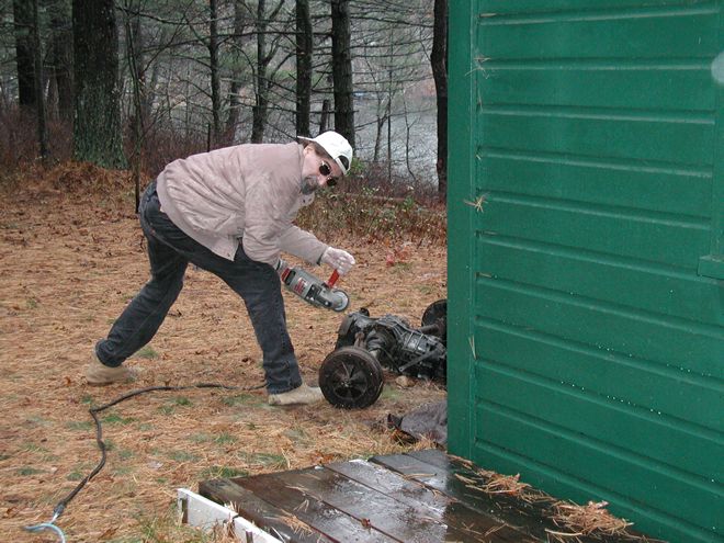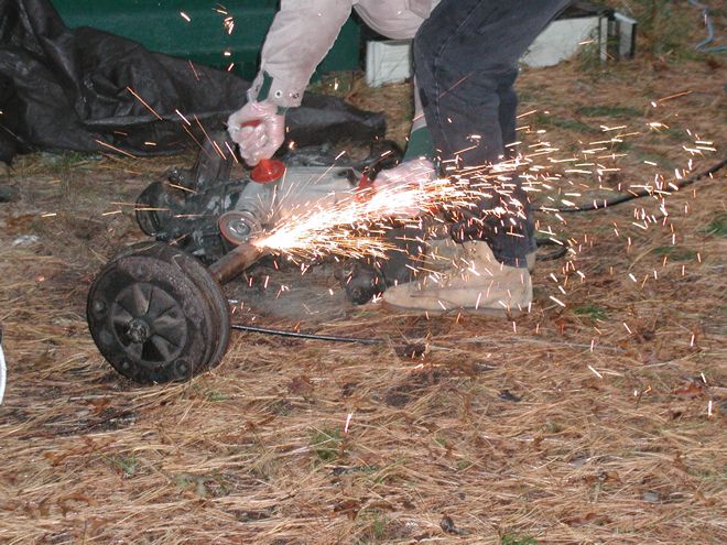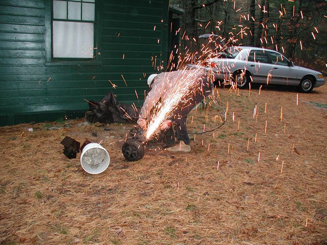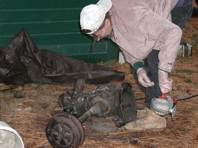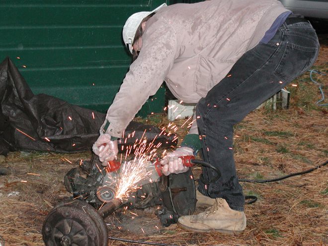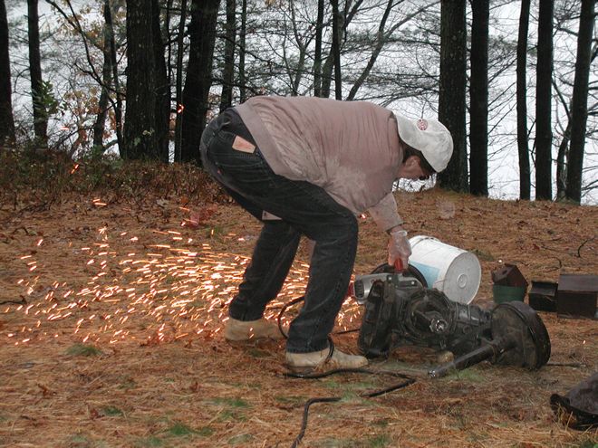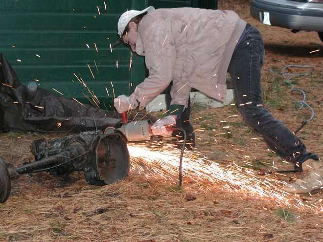 When I was a teenager working on the Battleship Massachusetts, I occasionally used an angle grinder, sometimes with a wire cup for cleaning steel preparatory to repainting and sometimes with a cutting wheel to smooth out steel where the welder had torched off some armor from a gun mount or whatever. When, years later, I had need to own my own angle grinder, I sought the most powerful one that I could find, which was a three-horsepower Milwaukee drawing fifteen amps. I can assure the uninitiated that that is a delightful amount of power to wield in one's hands. Once, while I was putting a heavy-duty finish on a floor, using a ram's wool bonnet to buff paste wax, I blinked —that is, I lost focus for a half a heartbeat. The machine grabbed the cord of the Electrolux I had nearby; wrapped the cord around itself and a few of my favorite fingers; and started swinging the Electrolux around before I could stop the it. This thing is big fun! Thus, when an automotive transaxle turned up in the woods, where it plainly did not belong, I was ready. It weighed a couple of hundred pounds and was articulated, so it was not something to toss in the trunk of my car without harming the car or me or both. It needed cutting. Yay!