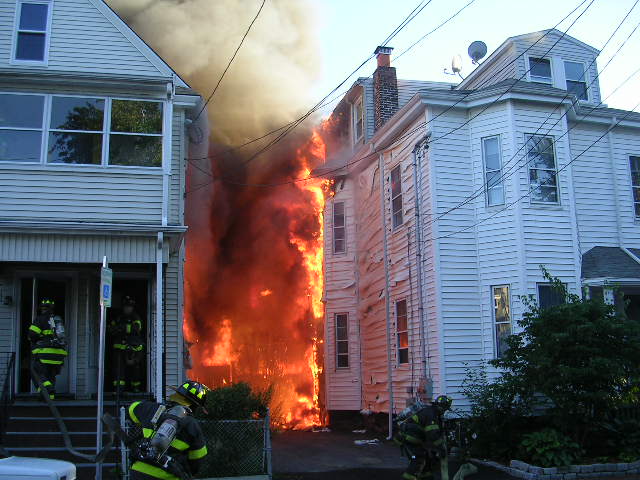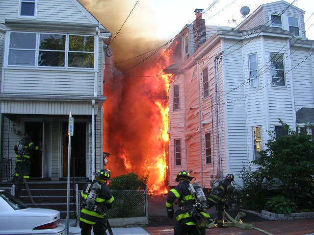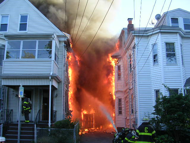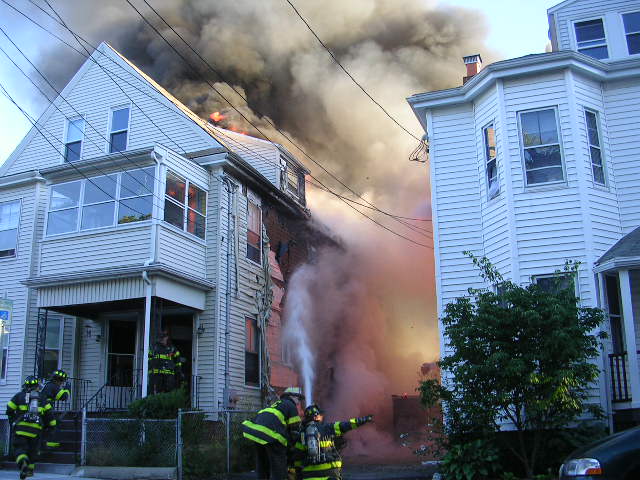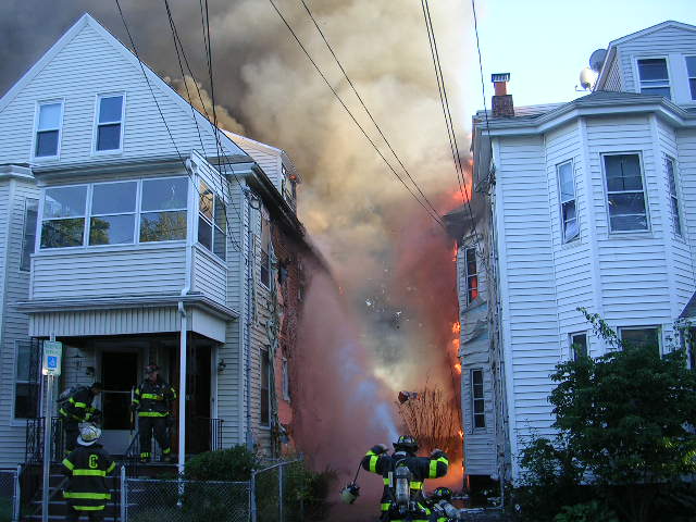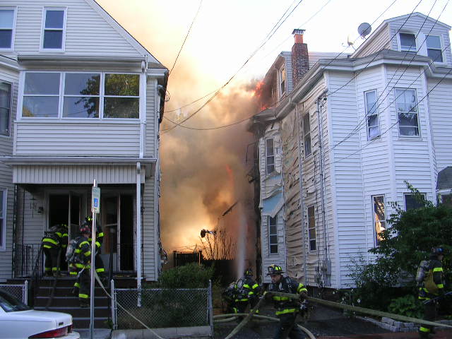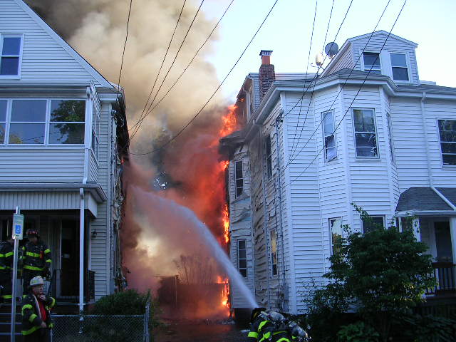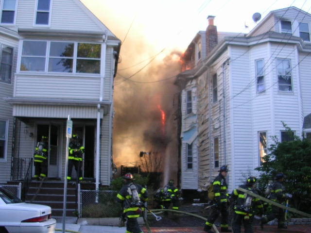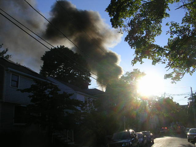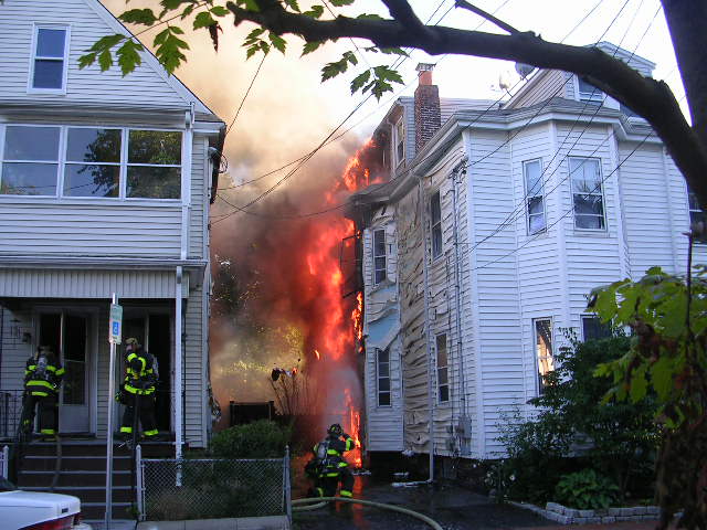 August 27, 2010 Fire on Hubbard Avenue, Cambridge While in a house on Walden Street this afternoon, I heard a lot of sirens wind down nearby. I went to investigate with an old camera in hand. On Hubbard Avenue, there were two houses afire and firemen just about to put some water to them. (The second of these photos was picked up by the Cambridge Chronicle for their report on the fire.) Home Back to Top |