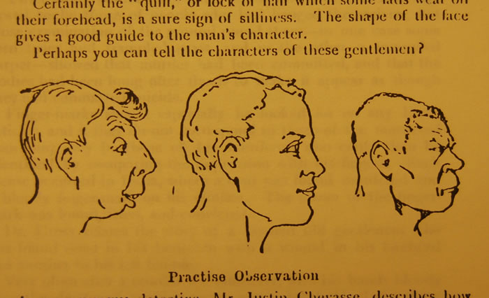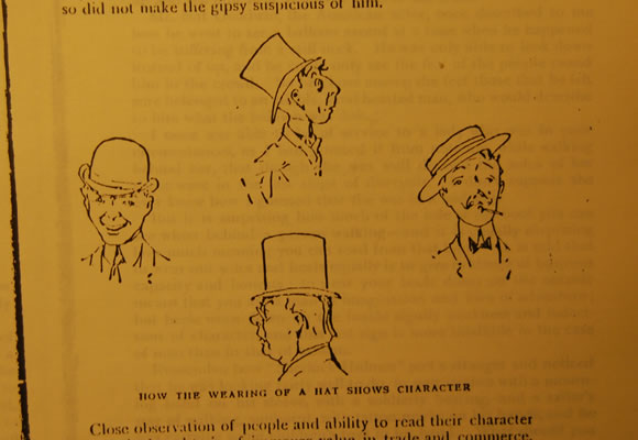 It is said that you can tell a man's character from the way he wears his hat. If it is slightly on one side, the wearer is good-natured; if it is worn very much on one side, he is a swaggerer; if on the back of his head, he is bad at paying his debts; if worn straight on the top, he is probably honest but very dull. Page 122 The shape of the face gives a good guide to the man's character.