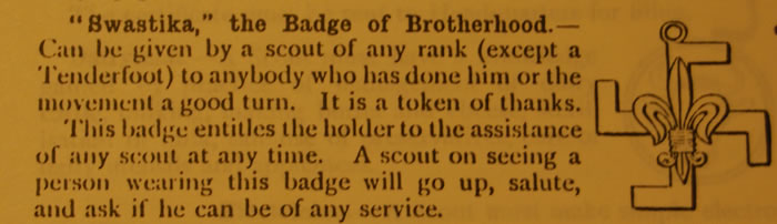 [Nine years before Nazism appropriated this ancient symbol.] Page 41 A salute is merely a sign between men of standing. It is a privilege to be able to salute anyone. In the old days the free men of England all were allowed to carry weapons, and when one met another each would hold up his right hand to show that he had no weapon in it, and that they met as friends. [We may infer that left-handed guys got away with murder, literally, in old England.] So also when an armed man met a defenceless person or a lady. Slaves or serfs were not allowed to carry weapons, and so had to slink past the freemen without making any sign. Page 42 To salute merely shows that you are a right sort of fellow and mean well to the others; there is nothing slavish about it. Page 42