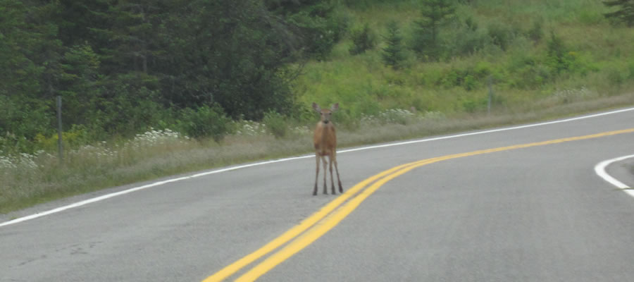 We have all seen roadsigns that read, "Falling Rocks," but who has ever seen falling rocks? On the stretch of Route 3 north of Pittsburg, New Hampshire, before the crossing into Chartierville, Quebec, there are plenty of signs warning of moose and deer. Those signs are quite serious. I spotted this deer in the road from about three hundred yards away, and it did not move until a few seconds after I stopped, quite close. This shot was taken through the windshield.