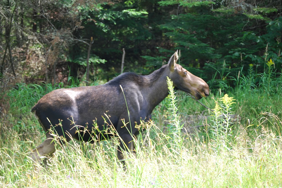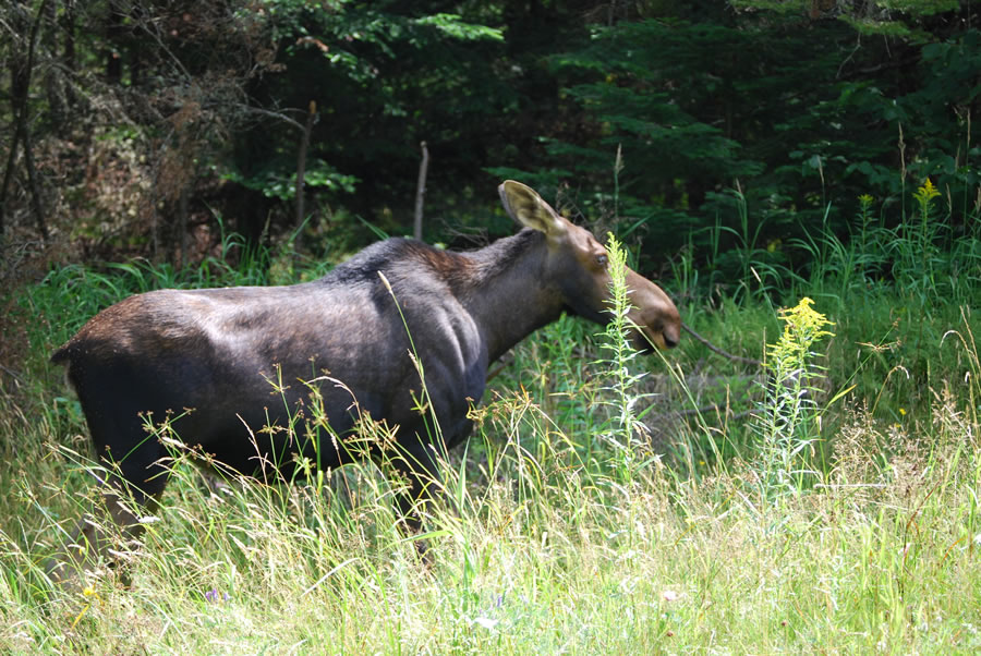 This moose was grazing by the road. As I slowed to a standstill, it moved a few yards and then stood still, seeming nonplussed by car and me, about thirty feet away. It stared directly at me and the camera in the open car window.