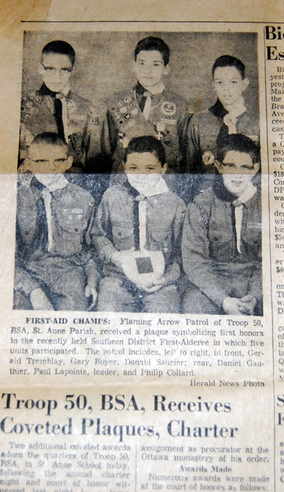 I think of it now because, recently while cleaning a drawer, I ran across an old Fall River Herald News clipping depicting the Flaming Arrow Patrol of Troop 50, of which I was the fearless leader, who won a first aid contest. That contest was a lot of fun, because I had convinced Danny and Phil that we should not inform the adult Scout leaders that we intended to participate. We were a bright group, and we did not need the grown-up supervision that our competition had. It was a kick to stop by the Assistant Scoutmaster's house that evening to let him know we had won a district championship. We won the Massasoit Council (the finals) contest too, but then the adults came along for that one, so it was not the same. Years and countercultures later, my then best friend Stevie Hawkins and I were on our way, on a Friday the Thirteenth, to see roommate Andy Paley's group Catfish Black do a gig in Harvard Square. (It must have been some kind of strange gig, because I remember that Andy borrowed Stevie's tights for the show.) Just after Stevie and I had crossed the foot of Garden Street in the Square, we heard a scream. A young woman, Marianne(spelling?) Dorsey, had just been pinned by two cars and was lying on the ground with a broken thigh. When I asked Stevie to go on without me she agreed, and I stayed to do what I could. With my Boy Scout training, I knew that there was something called "shock" and that it was important to make an injured person feel as comfortable as possible. I put my arm or jacket (can't remember) under her head and knelt beside her while I told her that she was very near a hospital and would soon get swell care and all that. Hovering above us were a few guys of my age, one of whom said, "We're Harvard medical students." I ignored them and gave my attention to gal on the ground. I rode with her in the ambulance and then walked away at the hospital entrance. I spoke with Marianne a few weeks later and learned that my attentiveness had been very helpful to her. I knew then that the training (parts of which were silly: think snakebites) that I had gotten in the Boy Scouts could actually be useful in a world far removed from the Boy Scout weltanshauung. Since that time, I have appreciated that no matter how screwy any given discipline might be, there is probably something that can be gained from it that is useful. How screwy is Buddhism? "No matter what happens, it is what is happening and is therefore acceptable." Well, that's just nuts. —Unless one happens at some time, just to get by, to have need to reach toward equanimity. Buddhism comes in mighty handy at that moment. One does not have to buy the whole farm to enjoy the fruit. Years later I was studying expository writing, and I complained to pal Ed that my teacher in a particular extension course was not bright enough to be very useful. He said, "That's no excuse not to learn something." Made sense to me. For search engines: Depicted are Gerald Tremblay, Gary Boyer, Donald Saucier, Daniel Gauthier, Paul Lapointe, and Philip Collard. |
