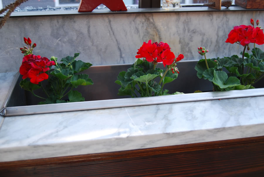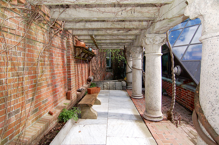 | The cloister, decked in marble, has a full-length planter fronted with marble. At each end are granite-enclosed planters. |