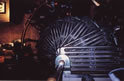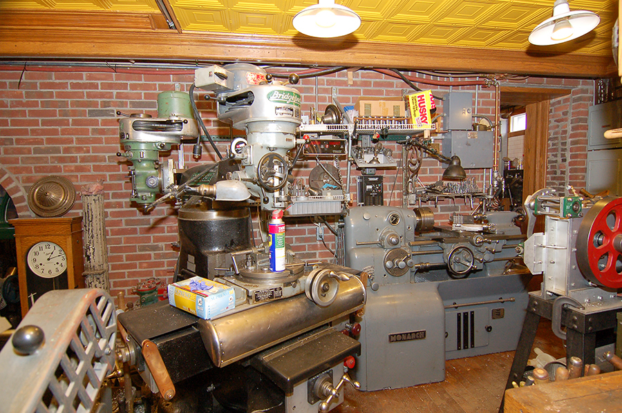| The ground level comprises this double-L-shaped room, a small office, a woodworking shop, a small indoor porch/hallway, and the studio. The floor is six-inches of end-grain yellow pine set on reinforced concrete. (Tanks wouldn't muss it.) In the center of this photo is a Bridgeport milling machine and to the right a lathe. At the extreme right, with the red flywheel, is one of the shop's products, a recently completed Stirling cycle engine. At the extreme lower right is the corner of the maple workbench, above which are oak cabinets with glass-panelled doors. The dooway, with pocket door, barely seen at the right leads to the woodshop. Opposite that door is the one to the office; also unseen is an industrial exhaust fan in the outer wall. |