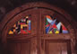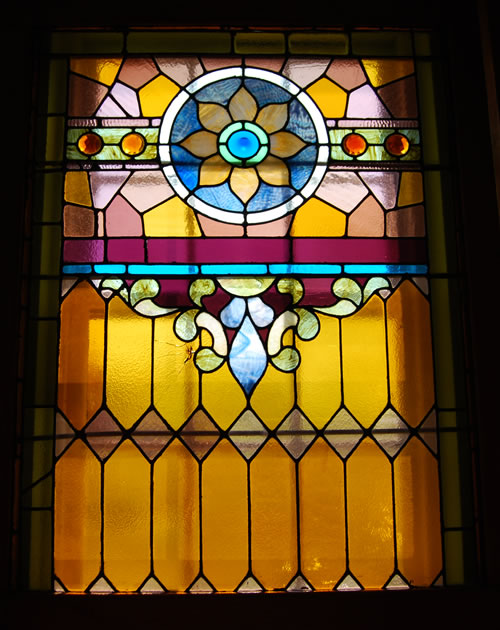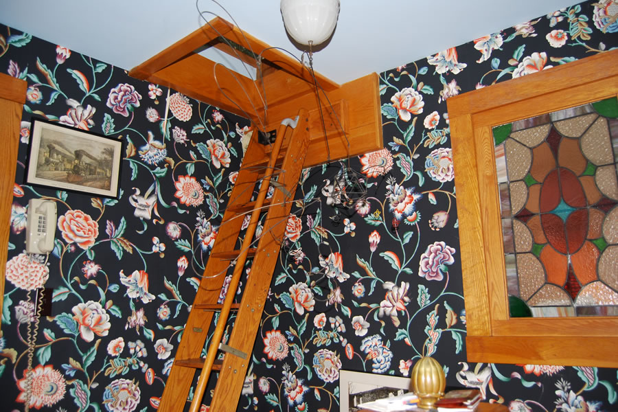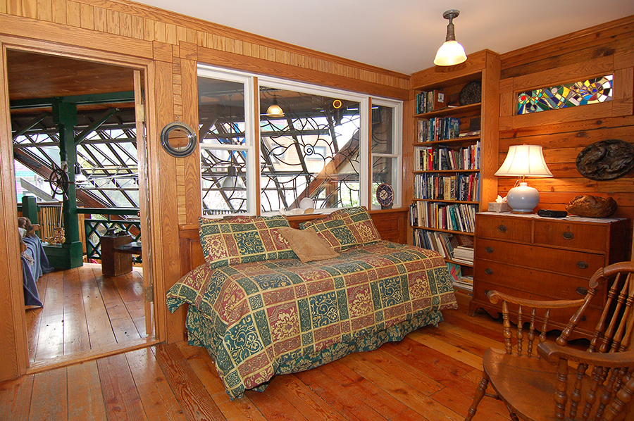 to the bathroom. In the middle of this picture is another antique stained-glass window at the top of the stairwell. The golden, wood-carved eagle rests on a cast-iron grate. Behind the grate and above the stairwell is an open loft, originally designed as a sleeping space for a young, visiting nephew.