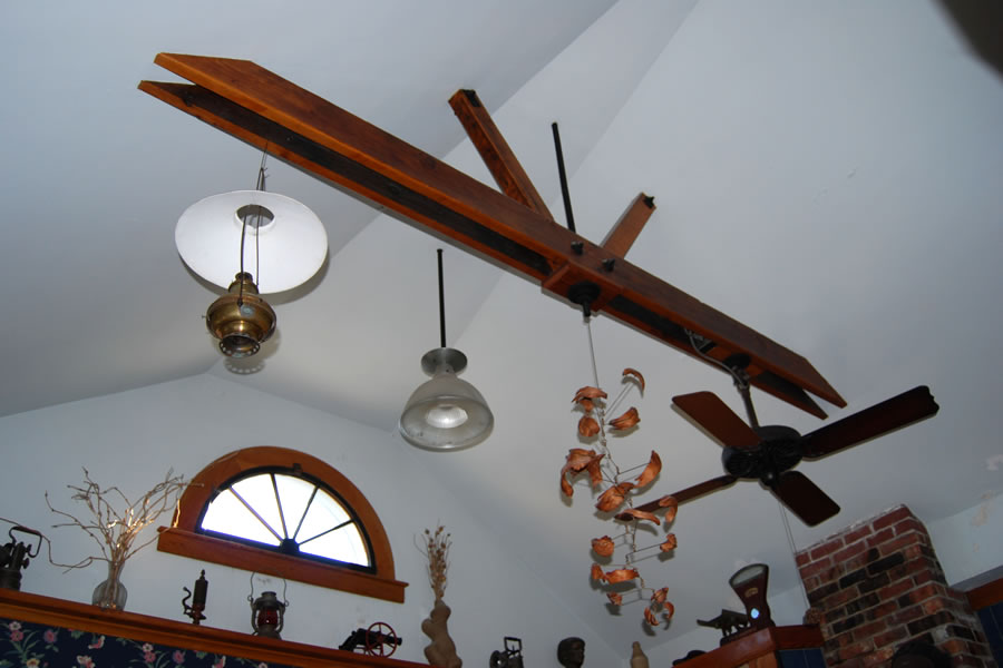 | The antique Holophane lights are two of many in the house. The rails on either side of the center are wrought iron. To the right, not seen, is an extremely heavy-duty cast iron circular stairwell that began life on the side of an huge boiler on Boston's waterfront. That stairwell leads to the ground-level studio, to another porch-like area, and to the basement below it. |