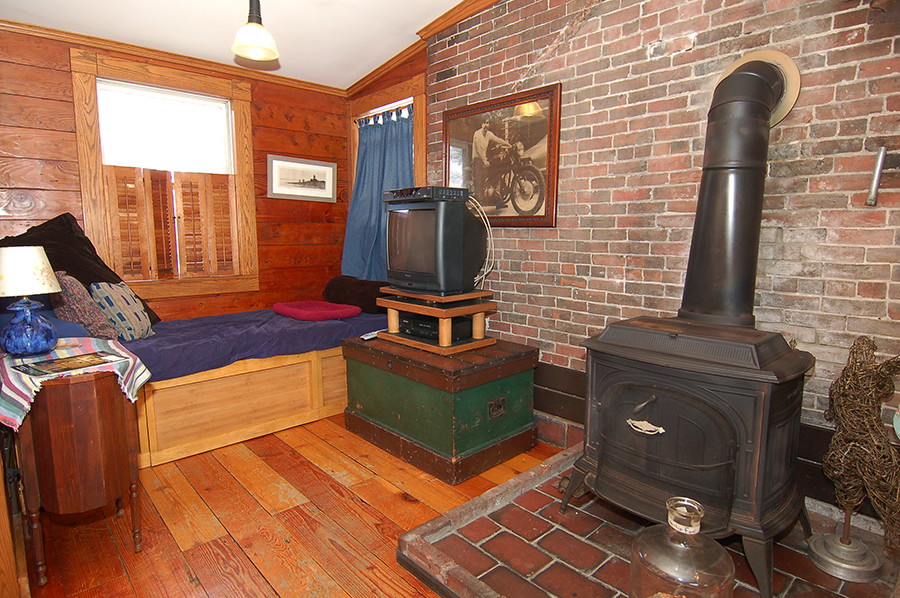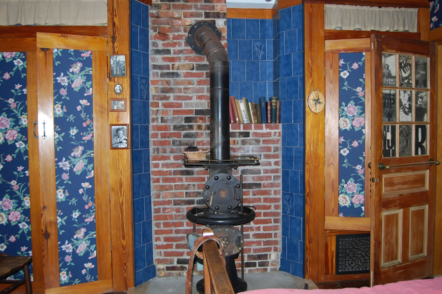 | The compendious woodstove comes from a railroad depot. |
