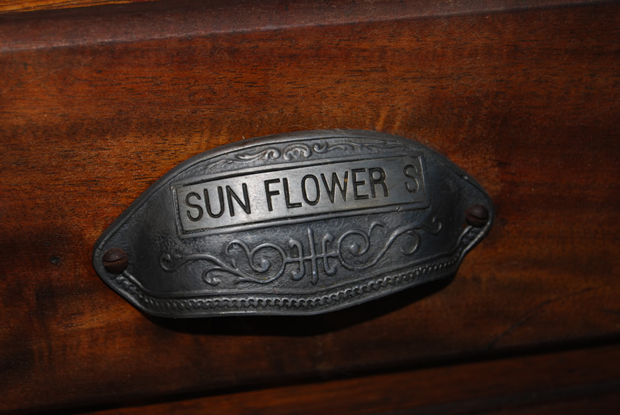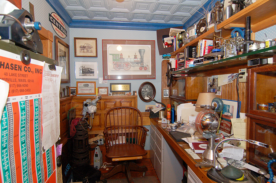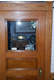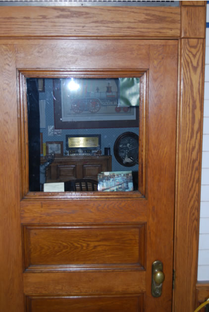 The small office has a tin ceiling, papered walls, and wainscoting of antique oak panels. The room has the same end-grain yellow pine floor as the machine shop area. The blue cornice is also antique wood, probably mahogany. A window at the left opens to Hampshire Street. The antique door is made of oak, bevelled glass, and brass locking passage set.