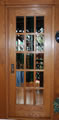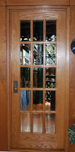open to a broad indoor balcony that overlooks the glass-roofed studio. The door was constructed new for the opening, using oak, fifteen highly bevelled glass panels, and an antique brass passage set.