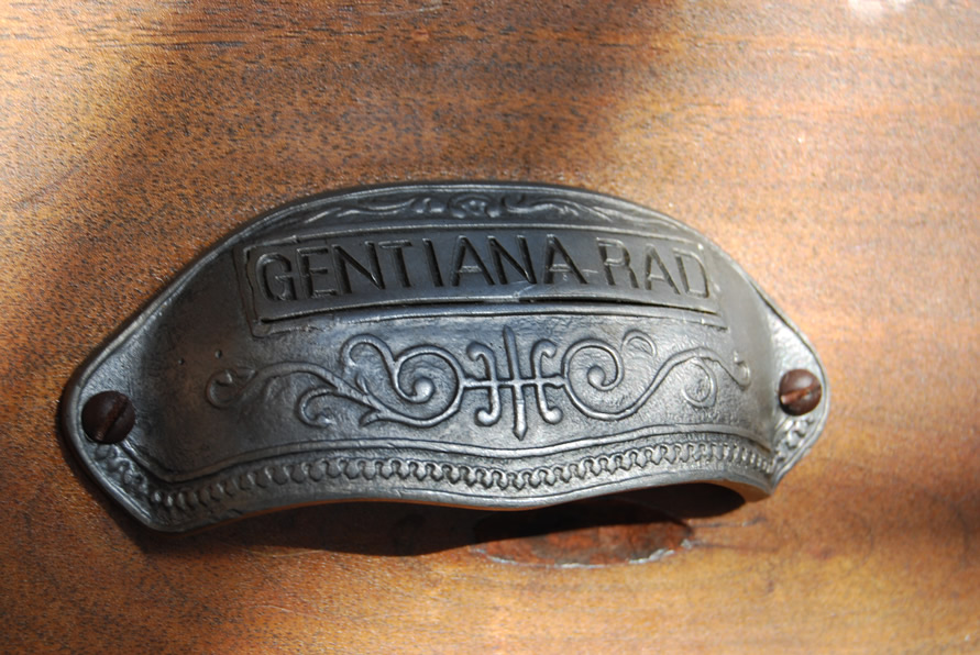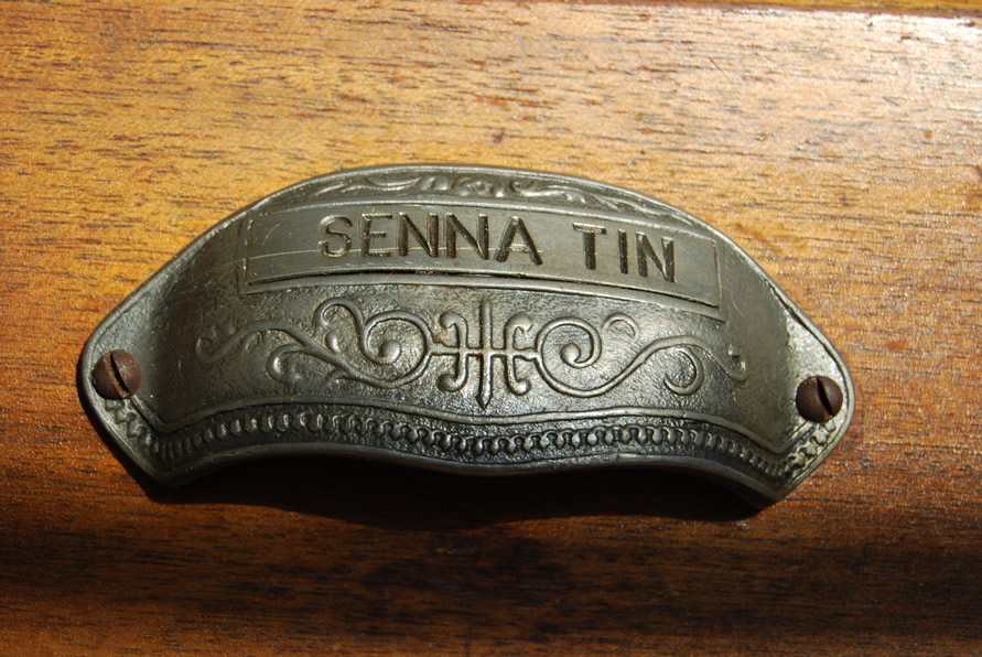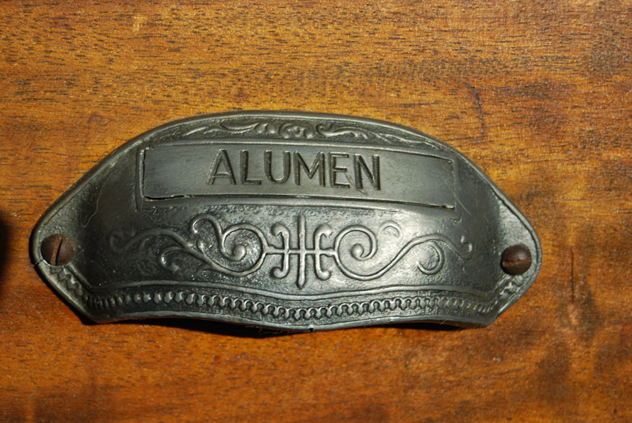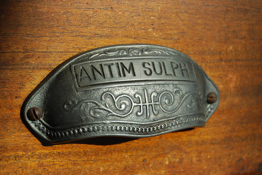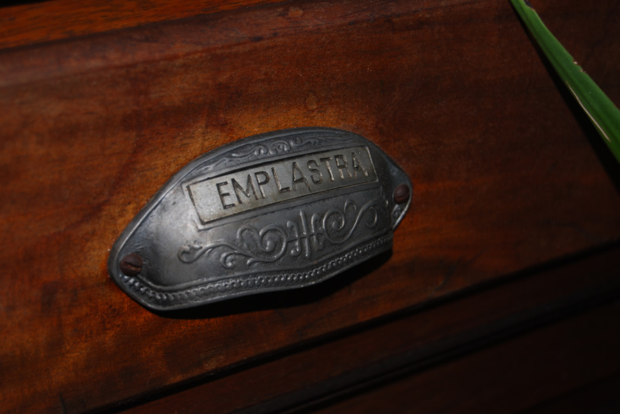 | The drawers come from a very, very old apothecary and retain their original pulls, each cast and engraved with the names of the long-gone contents. At the extreme left is a door that leads to storage space under the garage roof. |
