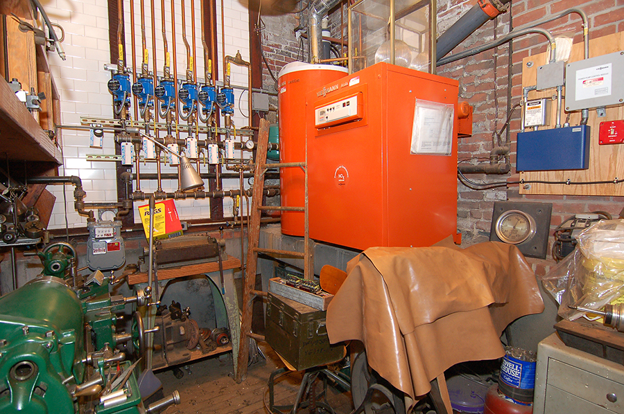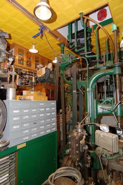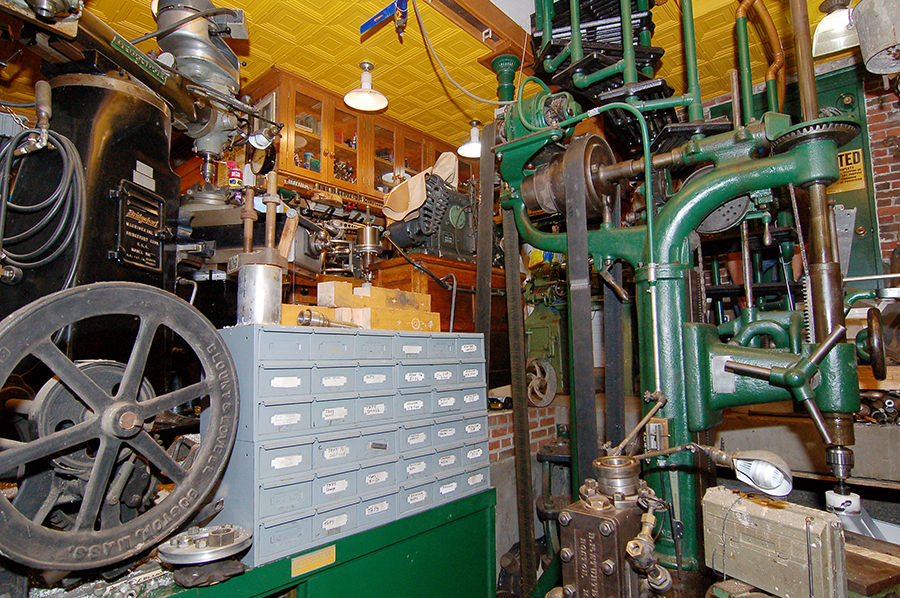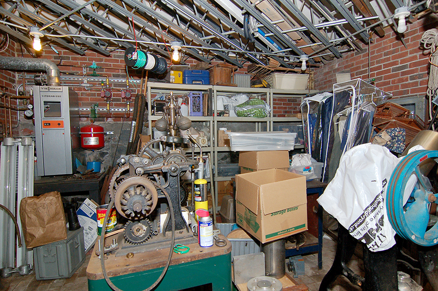| The main basement room is open on one side to the machine shop area of the ground level and shares the same tin ceiling. It also has an end-grain yellow pine floor. The buffalo-hide belt-driven drill press is nine and a half feet tall. |
