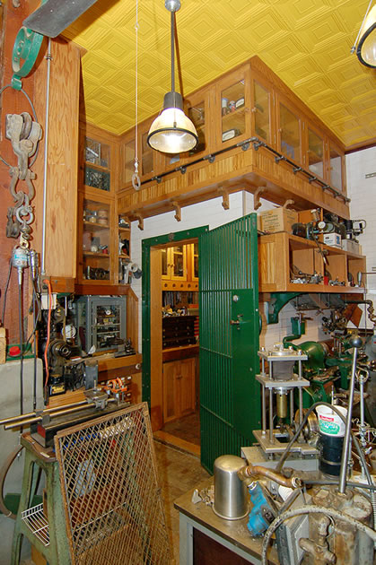 | In the corner is the tool crib or locker. The hardened steel door comes from a bank vault. |