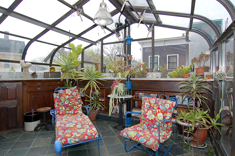 The upper glass sections of the stone-floored solarium open in warm weather. The sliding door leads to a porch overlooking the garden. The built-in, hardwood cabinetry is topped with marble that is fitted with stainless steel inserts to accommodate planters.