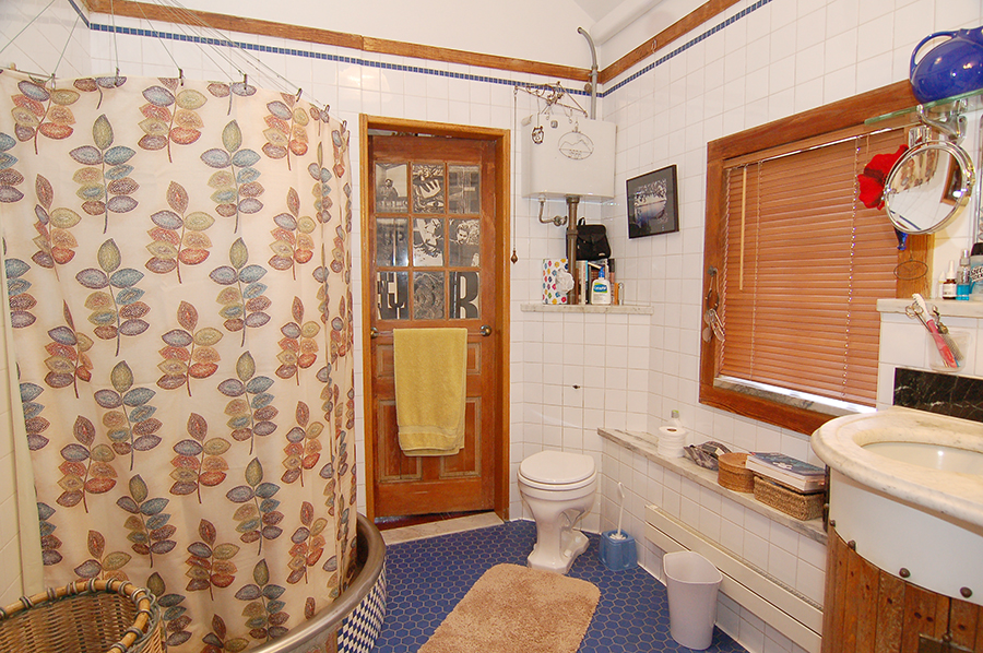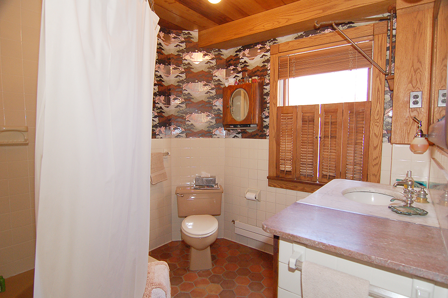 | The first-floor bathroom was wooden ceiling, tile and foil-paper walls, tile floors, and a custom-made wood, tile, and marble vanity. The tub is behind the curtain at left. |