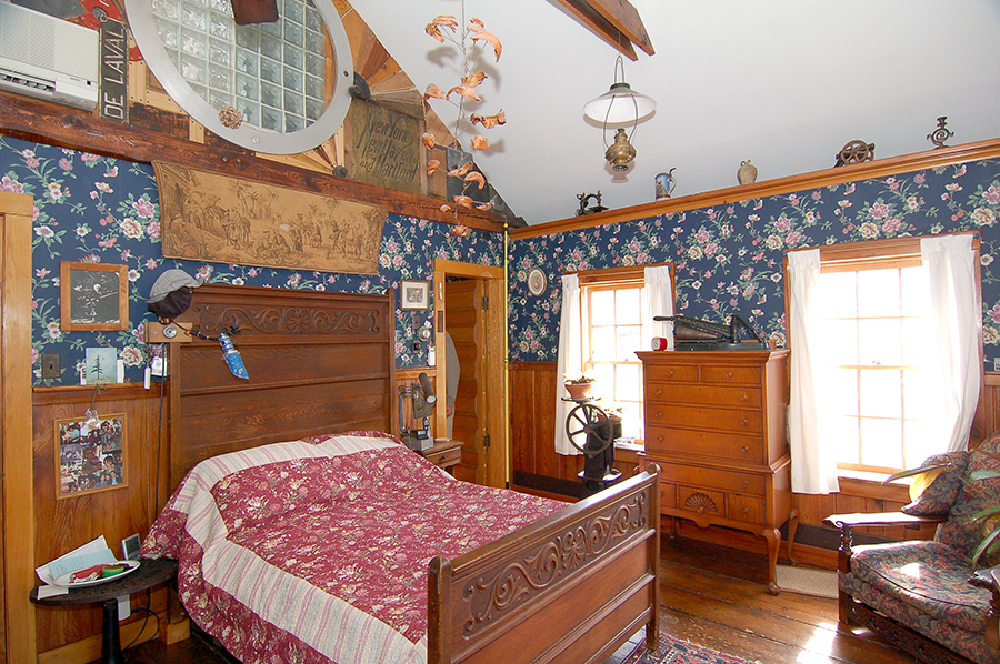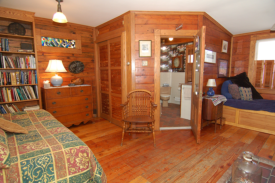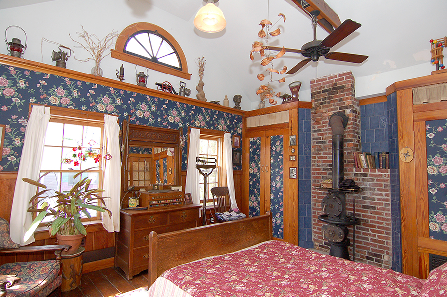 | The bedroom has a cathedral ceiling and the original floors. Like the living room, it has four windows. |