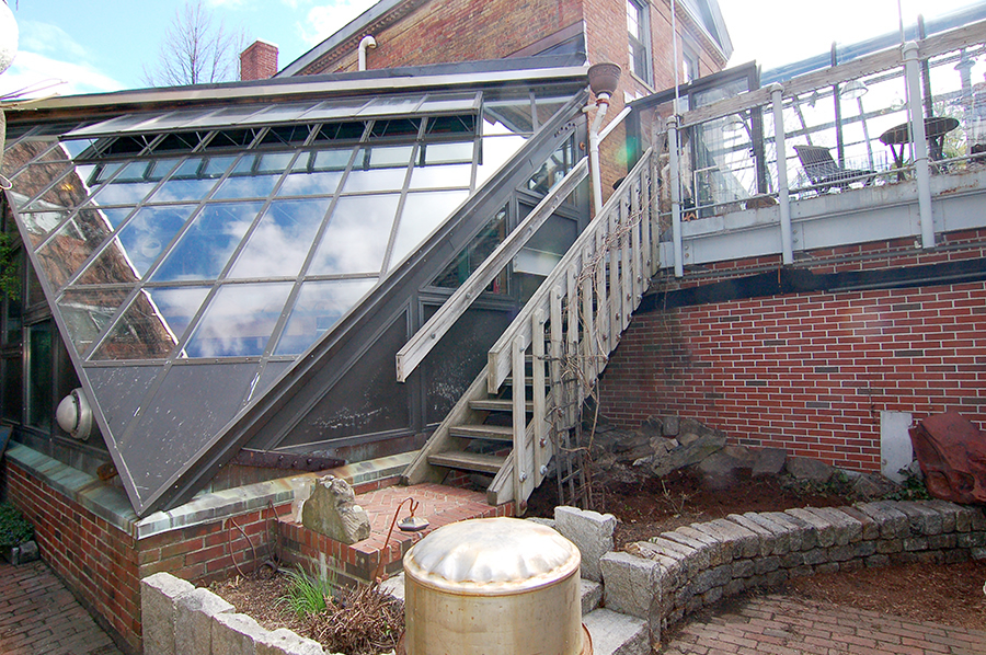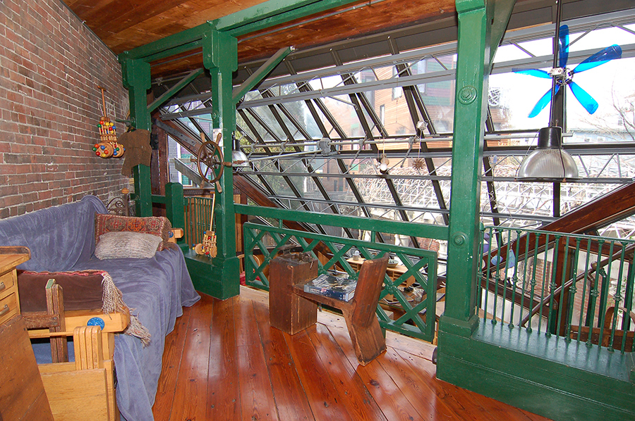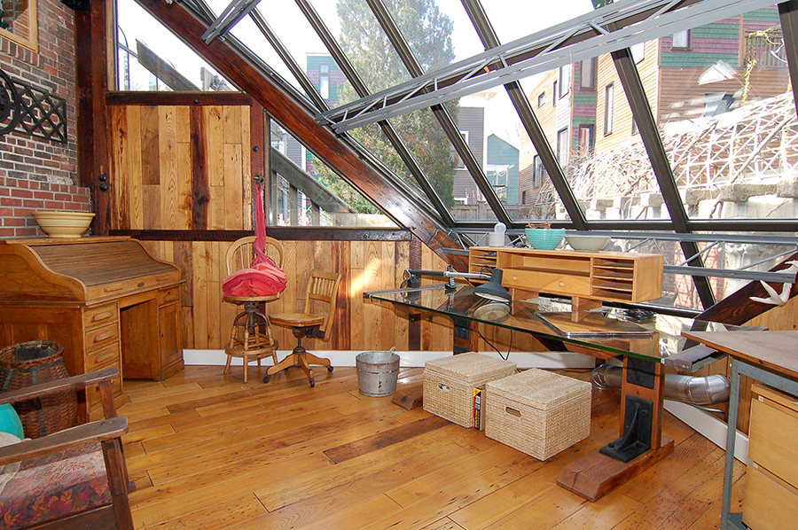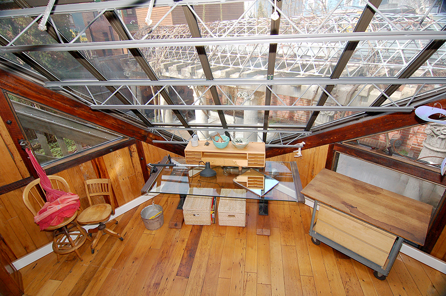 | Access to the two-story, glass-roofed studio comes via an extremely heavy industrial spiral staircase from the first-floor, indoor porch; from the ground-level, indoor porch/hallway outside the woodshop; and from the basement. |