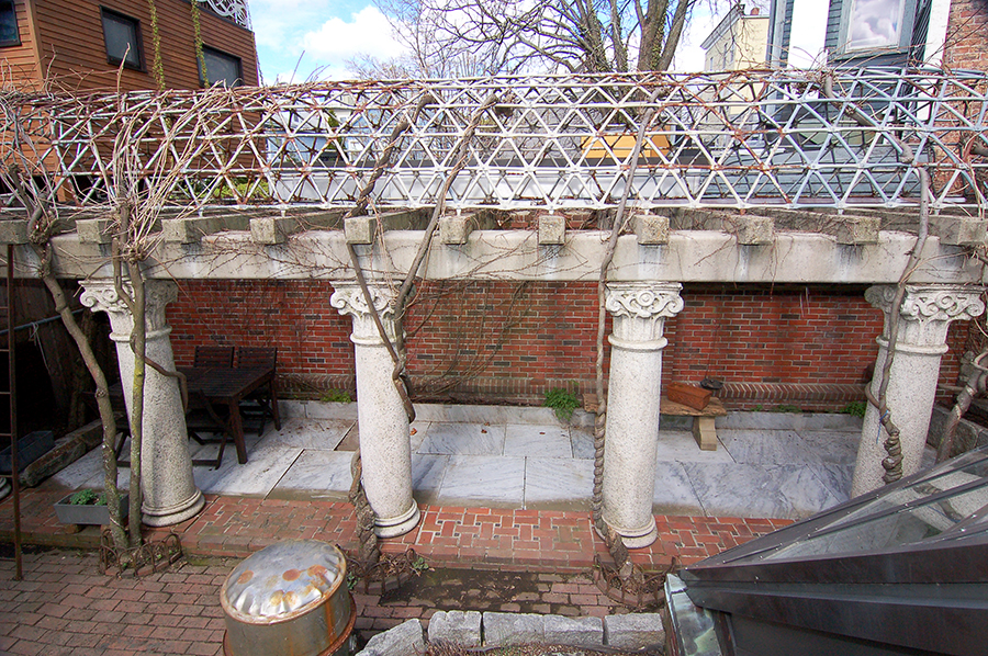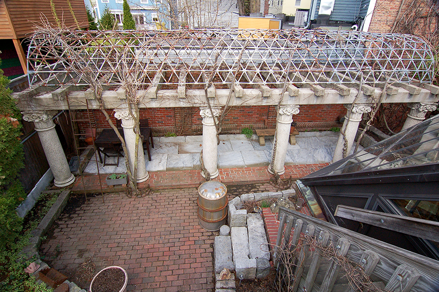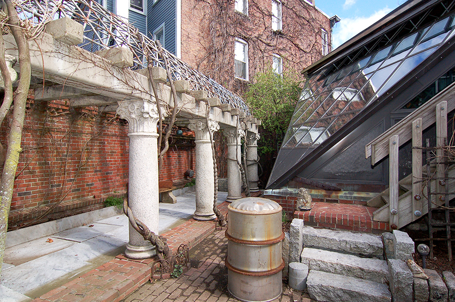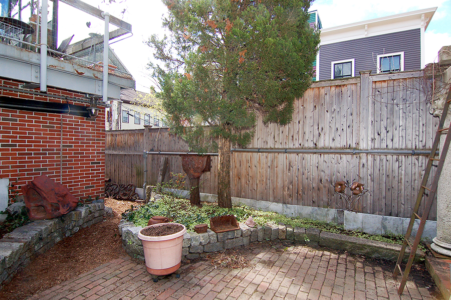 | At the end of the alley beside the studio is a drywell eleven feet deep. Just beyond is a garden shed and the steel door to the ground level. |