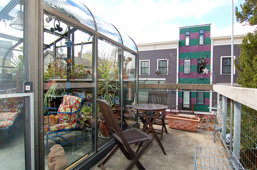 | The solarium's porch overlooks the garden, to the right. |