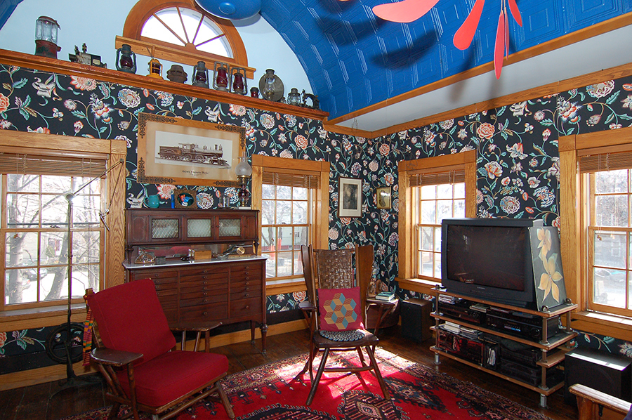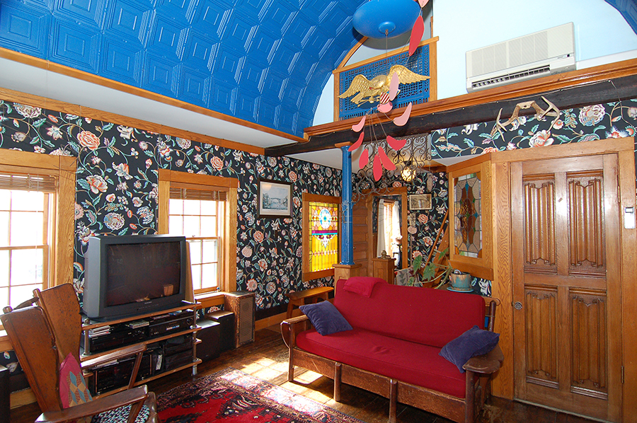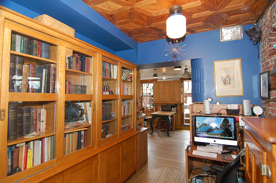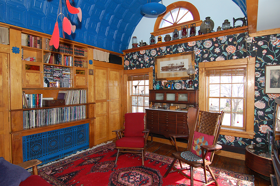 | The barrel-vaulted ceiling is tin. Like all the tin ceilings in the house, it was back-primed, then primed on the faces, then painted with two coats of alkyd (oil-based) enamel. The blue cast iron grate, between the closets and below the bookcases and cabinetry, admits heat via a stainless steel reflector from the railroad depot woodstove below. |