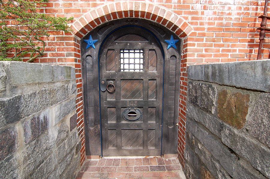 | The front door to the ground level was inspired by cloister doors in Westminster Abbey (one example), although this one is heavier. It is four and a half inches thick and is set into a fitted steel frame an inch thick. While everything above is at least institutional-grade —like what one would find in old churches and hospitals— this door accurately portends that one is entering a realm of the seriously industrial-grade. Beyond this door is a small vestibule and then a second door that leads to the ground-level rooms. |