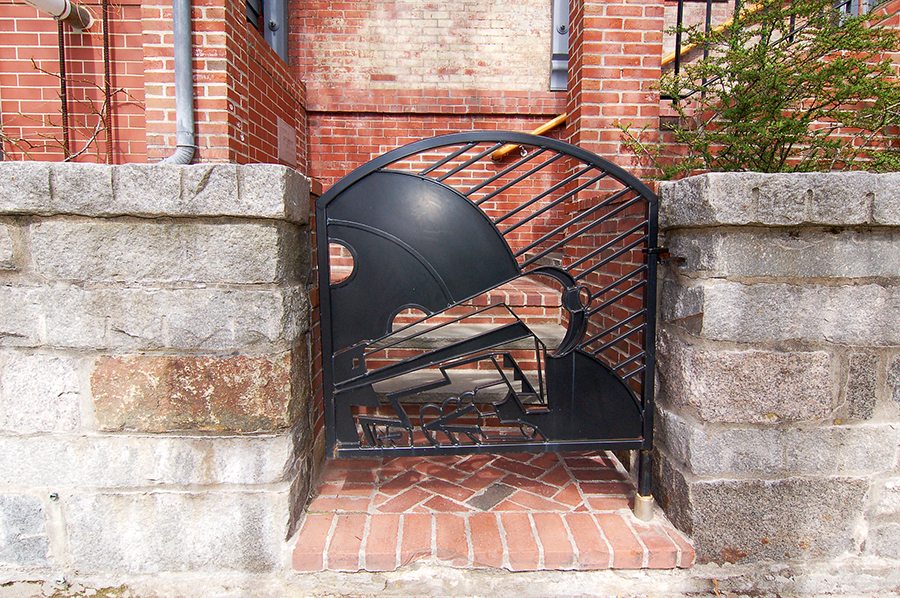 | The custom-made gate to the stairs to the first floor door is a representation of the 20th Century Limited locomotives of the 1920's and '30's. |