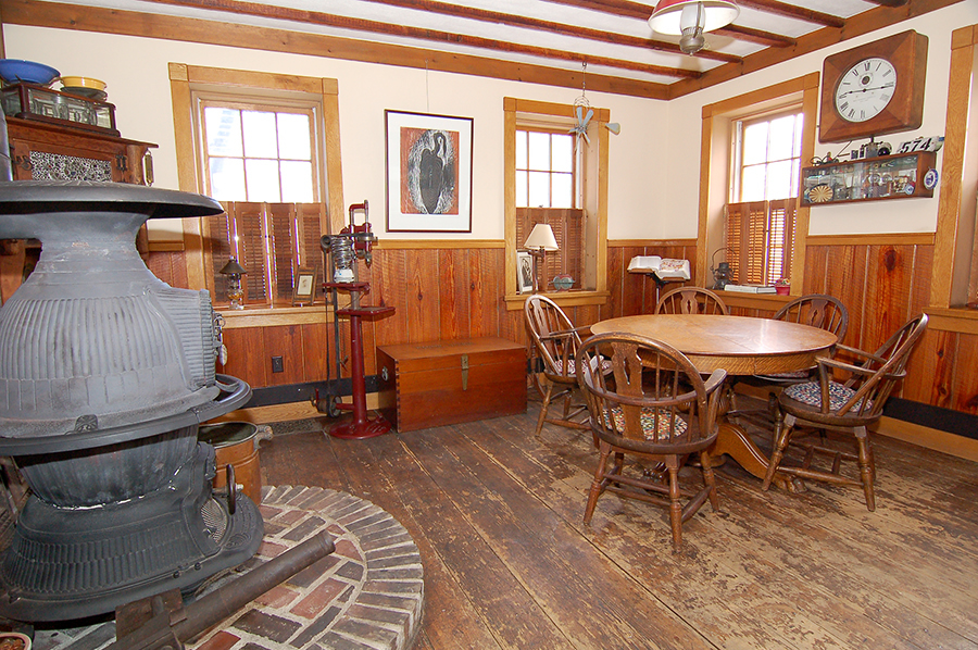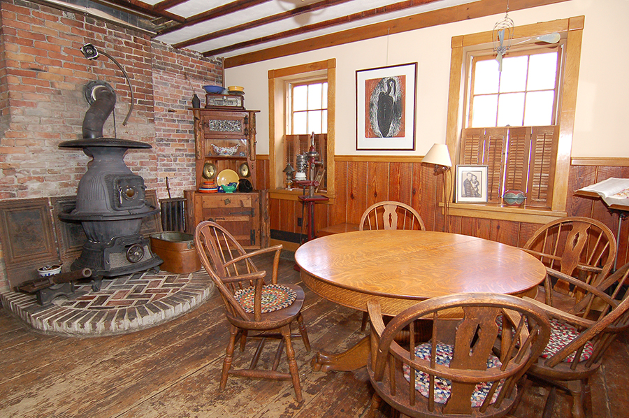 | The floors of the dining room are original and nearly two hundred years old. The edges of the original floor joists extend from the ceiling. |
