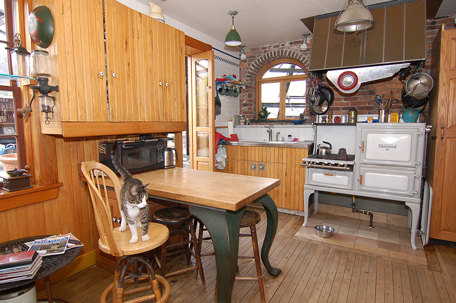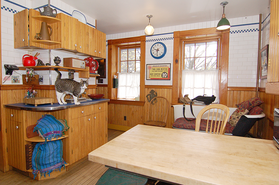 | The kitchen has oak cabinetry, maple floors, and yellow pine wainscoting. The walls are of institutional tile of the kind that can be seen in old hospitals and subway stations. |