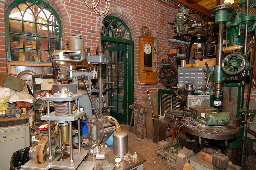 | Beyond the drill press is a spiral stairwell that was constructed onsite of radiator leaves and other plumbing. It leads to the solid steel, panelled double doors of the first floor foyer. |