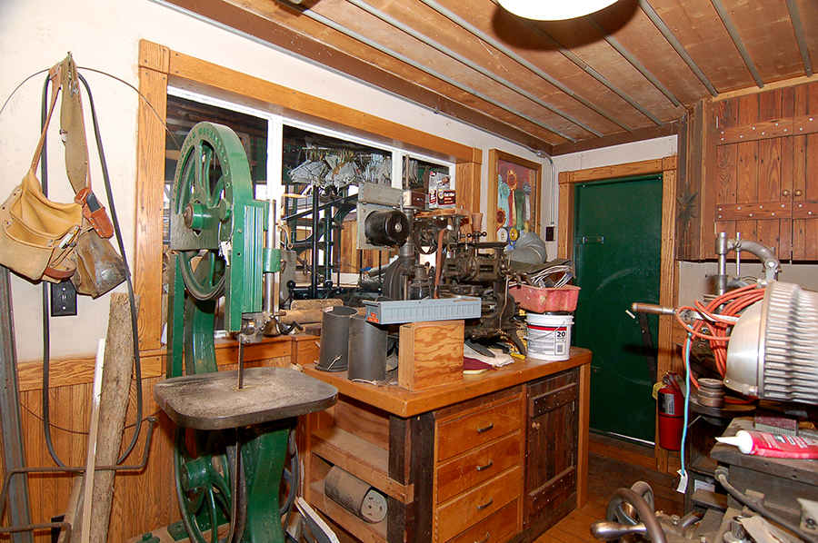 | This photo depicts only a small part of what is in the woodshop. To the left, unseen, is a door leading to the hall/indoor porch that leads to the studio and the basement below. To the left of that door is a woodstove hand-built of cast iron. Behind the bandsaw and above the maple bench is a window that admits light from the glass-roofed studio. The green door is solid steel three-quarters of an inch thick, with integral decorative steel panels on the obverse (other) side. It opens to the garden. To the right of that are seen cabinets, which are above a long maple workbench. The wall opposite this wall with window has two small windows above a bluestone sink and a one-inch-thick steel workbench. |