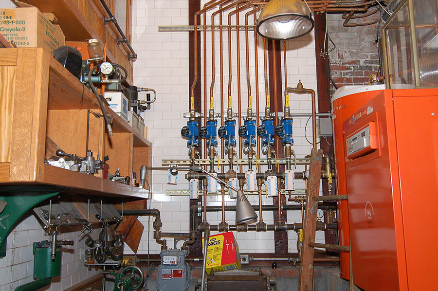 | On the opposite side is the central heating system, all meticulously executed and strictly industrial-grade. |