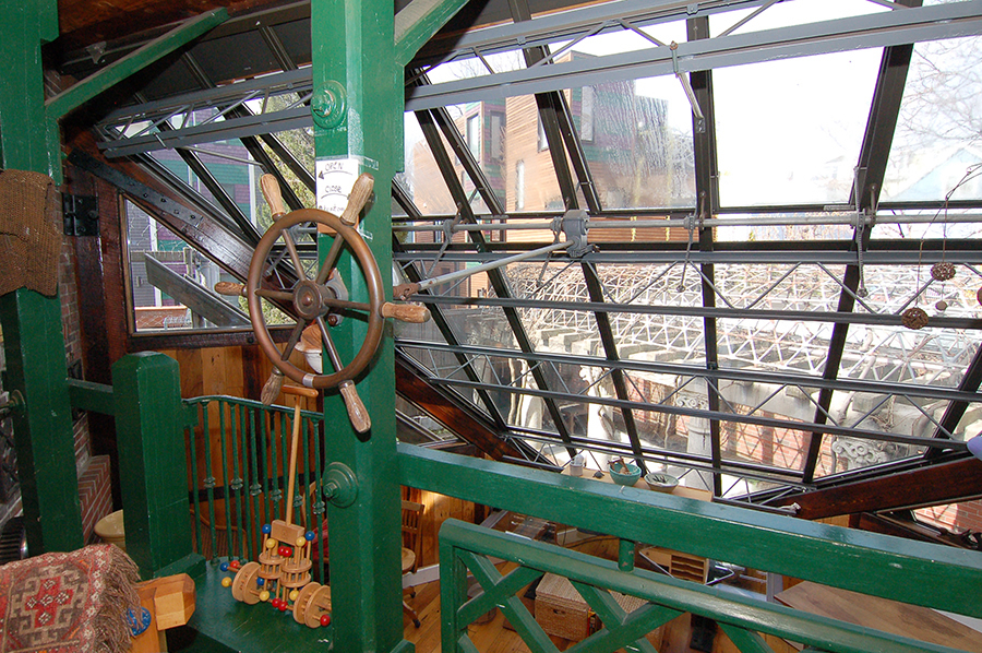 | The antique ship's helm opens a wide swath of the studio's glass roof, seen here slightly open. |