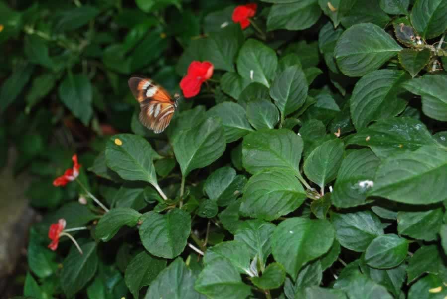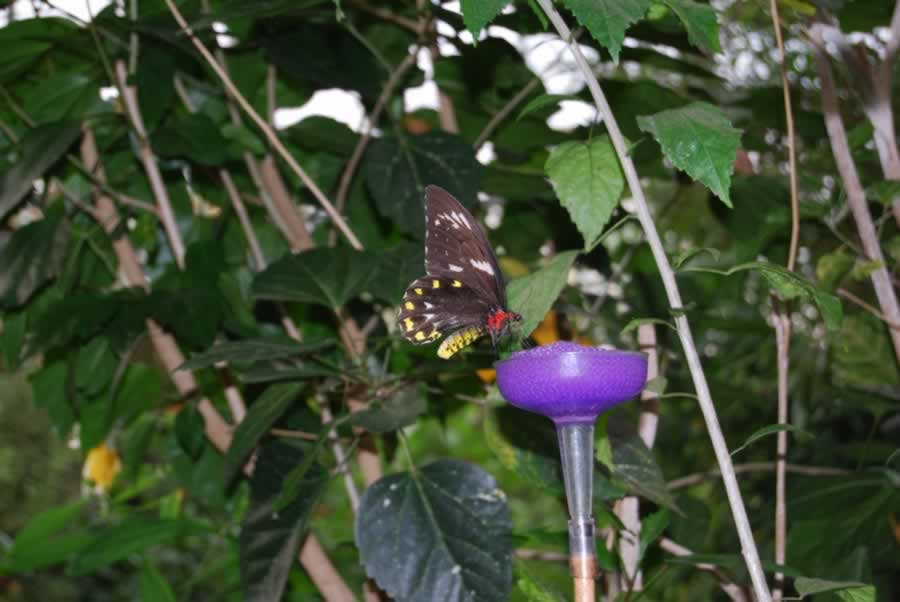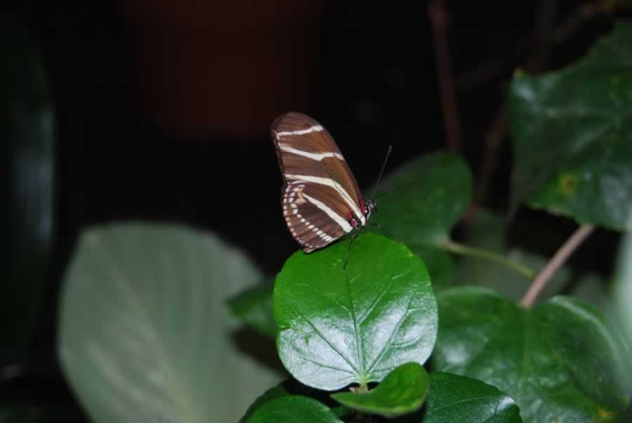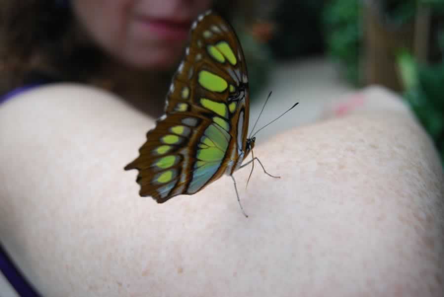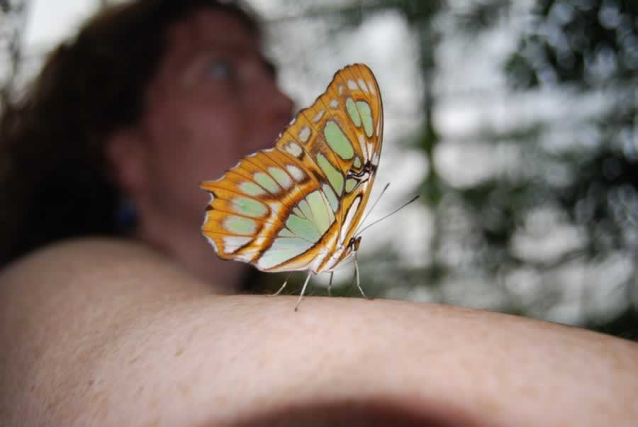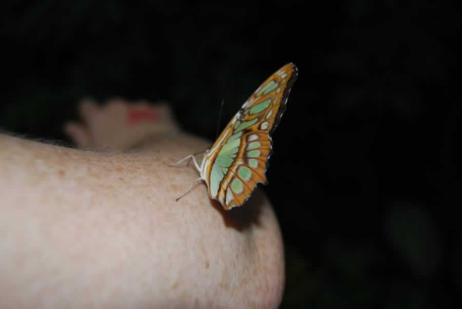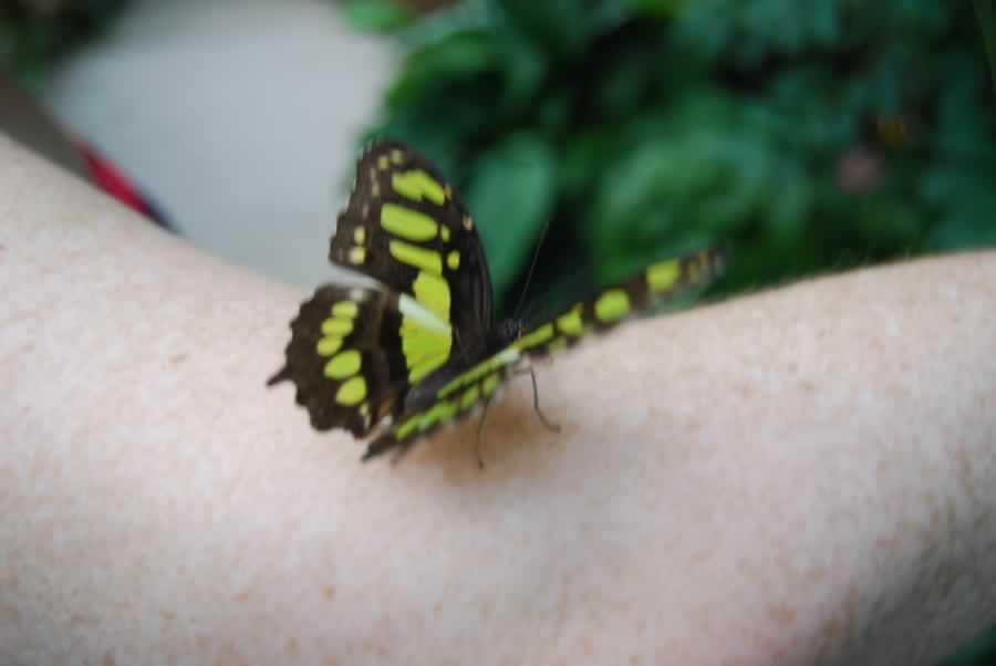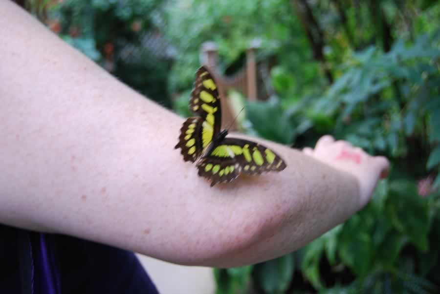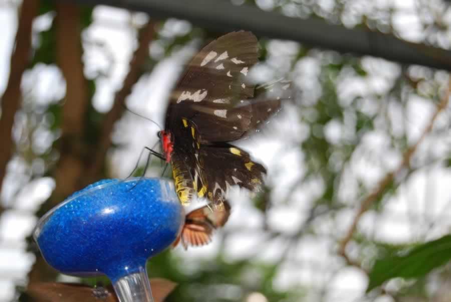 Usually on the Fourth of July I watch the Boston fireworks from my rooftop, but this year the temperature topped off at 94, and I felt like getting out of town. My destination proved an ironic choice for getting out of the hot city. I picked Magic Wings Butterfly Conservatory in South Deerfield. One might reasonably suppose that such a place would be heated and humidified, but, holy cow!, they ought to issue machetes to guests for cutting through the air.
