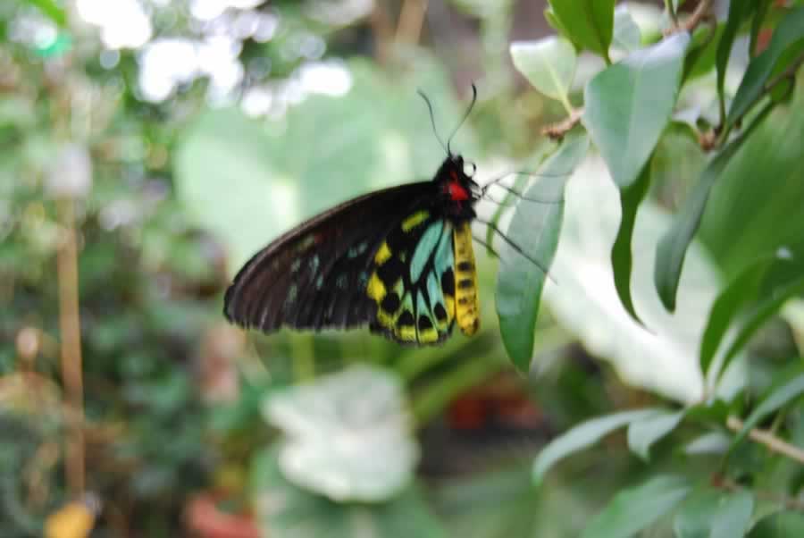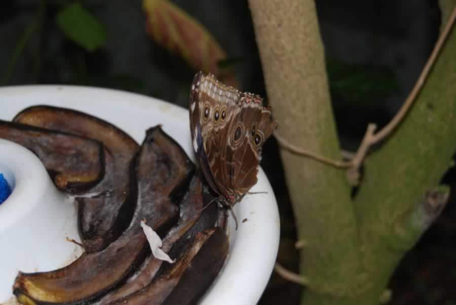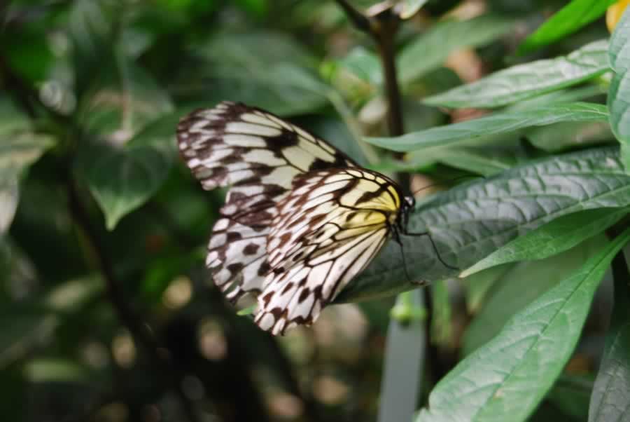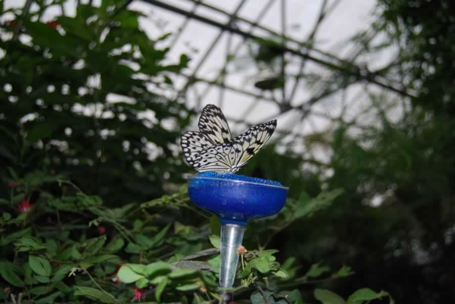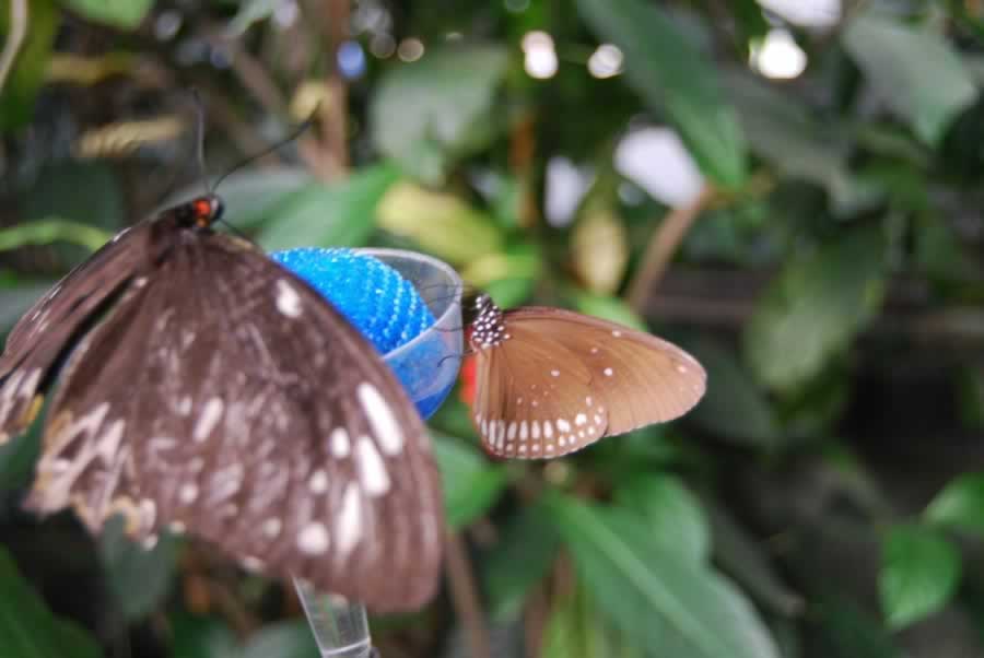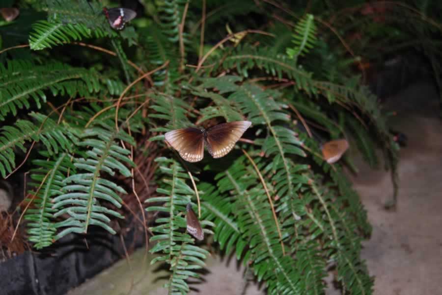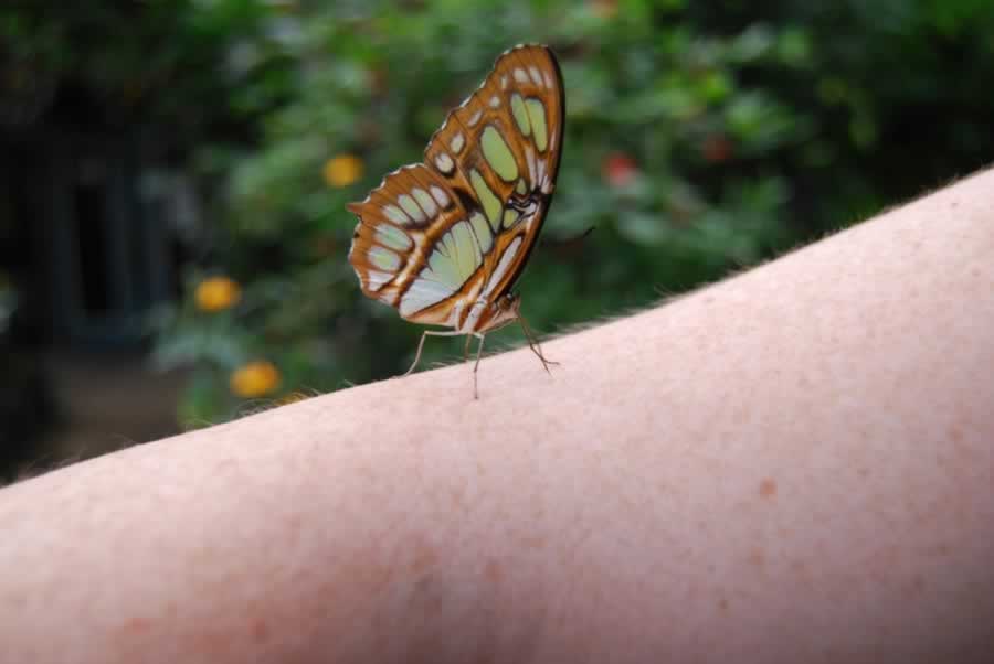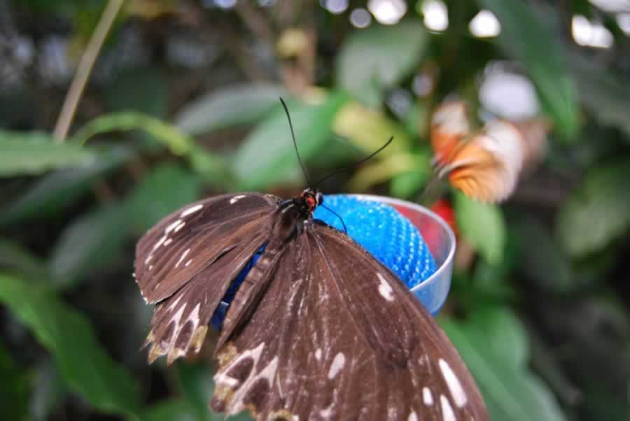 Usually on the Fourth of July I watch the Boston fireworks from my rooftop, but this year the temperature topped off at 94, and I felt like getting out of town. My destination proved an ironic choice for getting out of the hot city. I picked Magic Wings Butterfly Conservatory in South Deerfield. One might reasonably suppose that such a place would be heated and humidified, but, holy cow!, they ought to issue machetes to guests for cutting through the air.