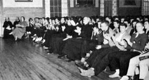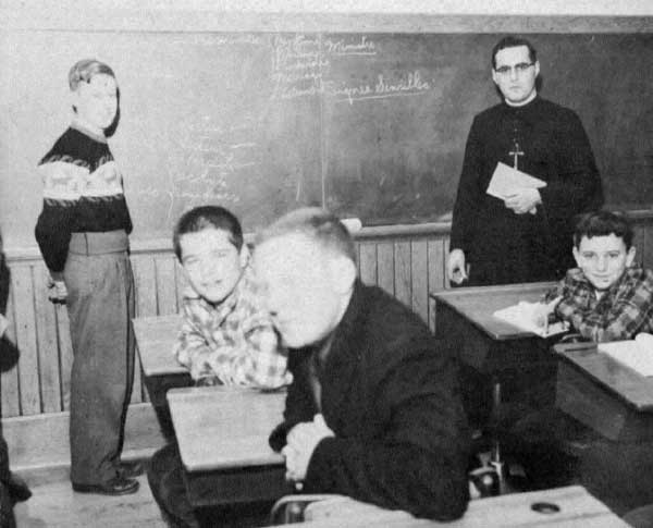 The Glee Club: Because of limited opportunities for group[ rehearsals, our musical program for 1955-56 suffered a considerable reduction. However our Glee Club, under the joint direction of Brother Alban, principal, and brother Reginald, did manage to make an appearance in the Third French Music Festival held at Ste. Anne's Auditorium in February. |