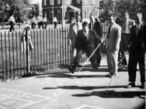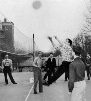 Sophisticated underclassmen indulge in shuffleboard while seniors line up for football. |