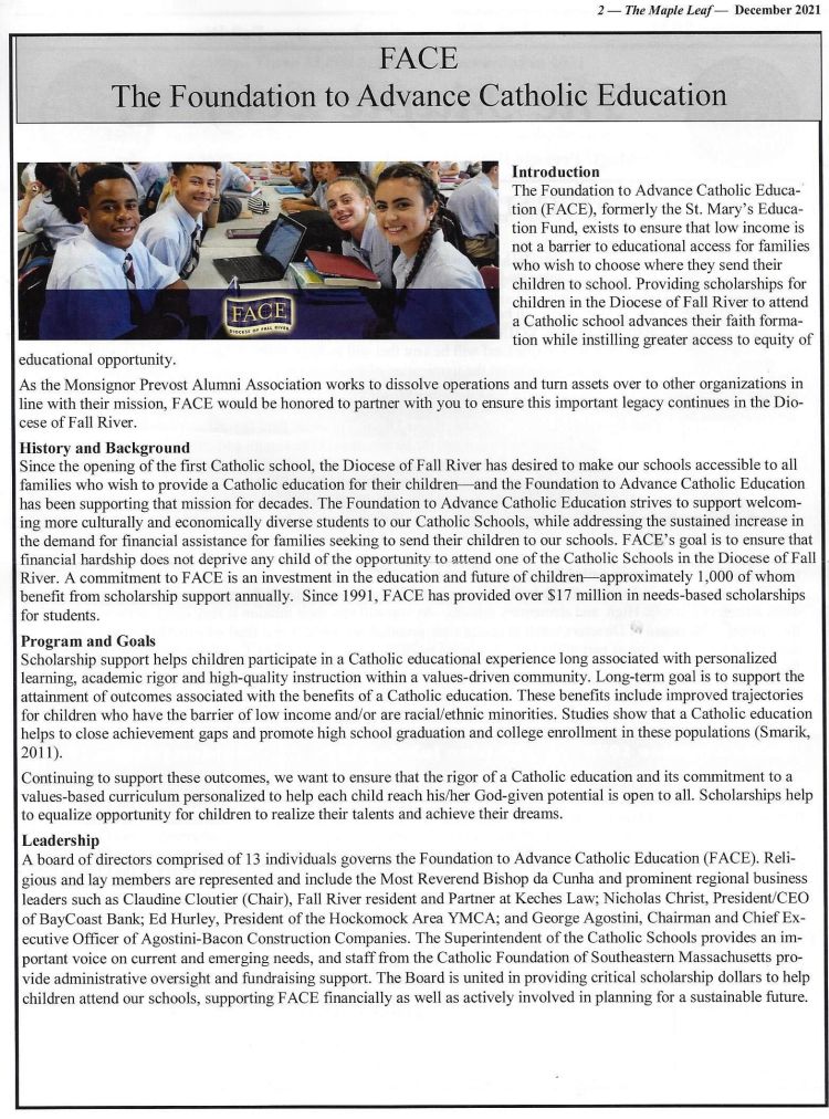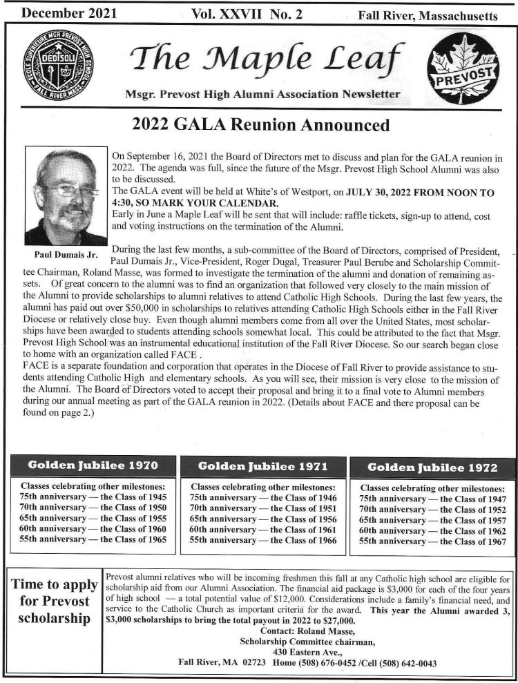 The Maple Leaf is the Msgr. Prevost High Alumni Association Newsletter and the latest copy December 2021 edition is posted below for your viewing.
