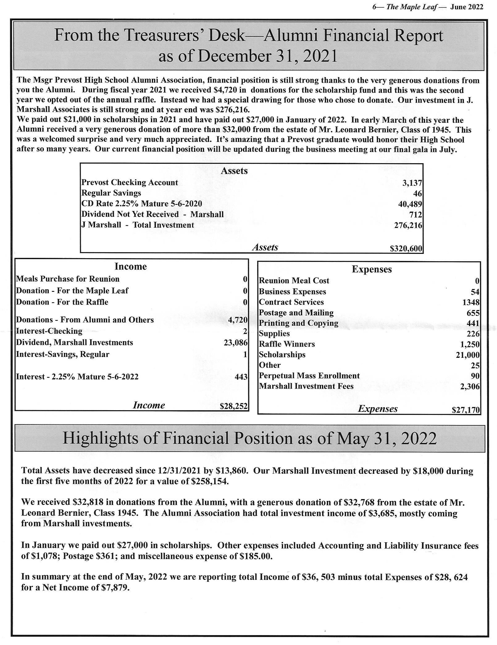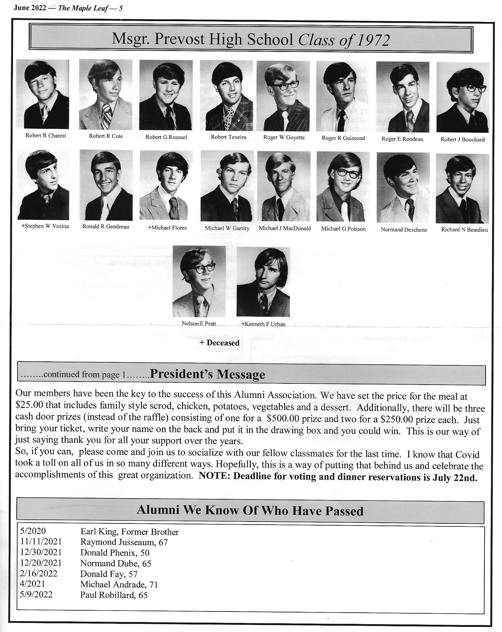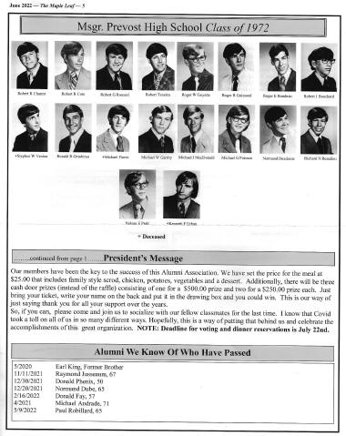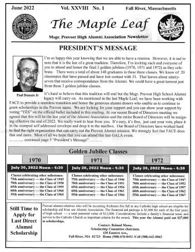 The Maple Leaf is the Msgr. Prevost High Alumni Association Newsletter and the latest copy June 2022 edition is posted below for your viewing.