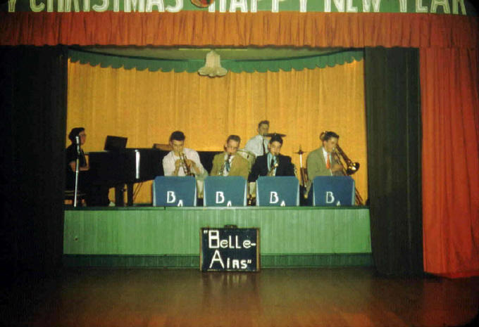 While we were at Prevost we also formed a dance band, the "Belle-Airs" L to R - Claudette Vanasse-piano, Denny Gendreau-trumpet '57, Gerry Letourneau-alto sax '59, Gerry Guay- drums '59, Pete Vanasse / tenor sax '58, Ray Vincent-trombone '57 |